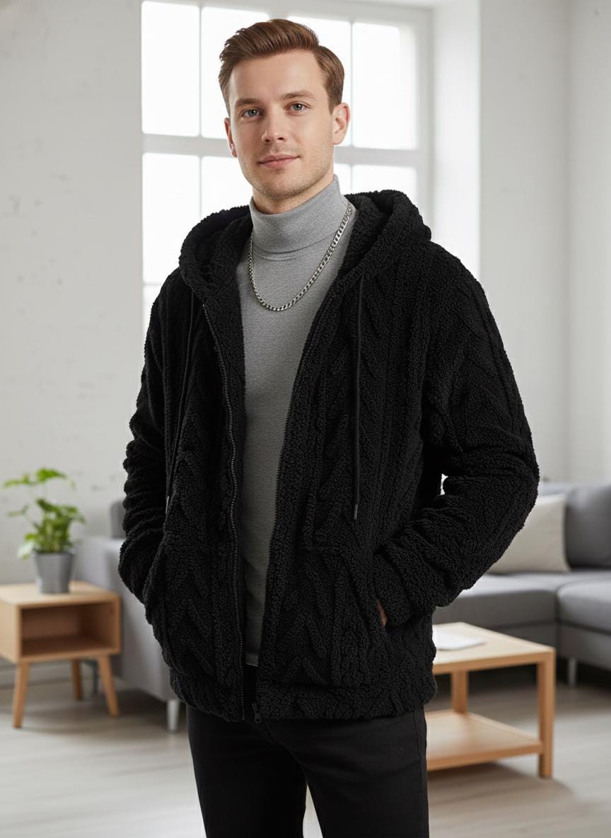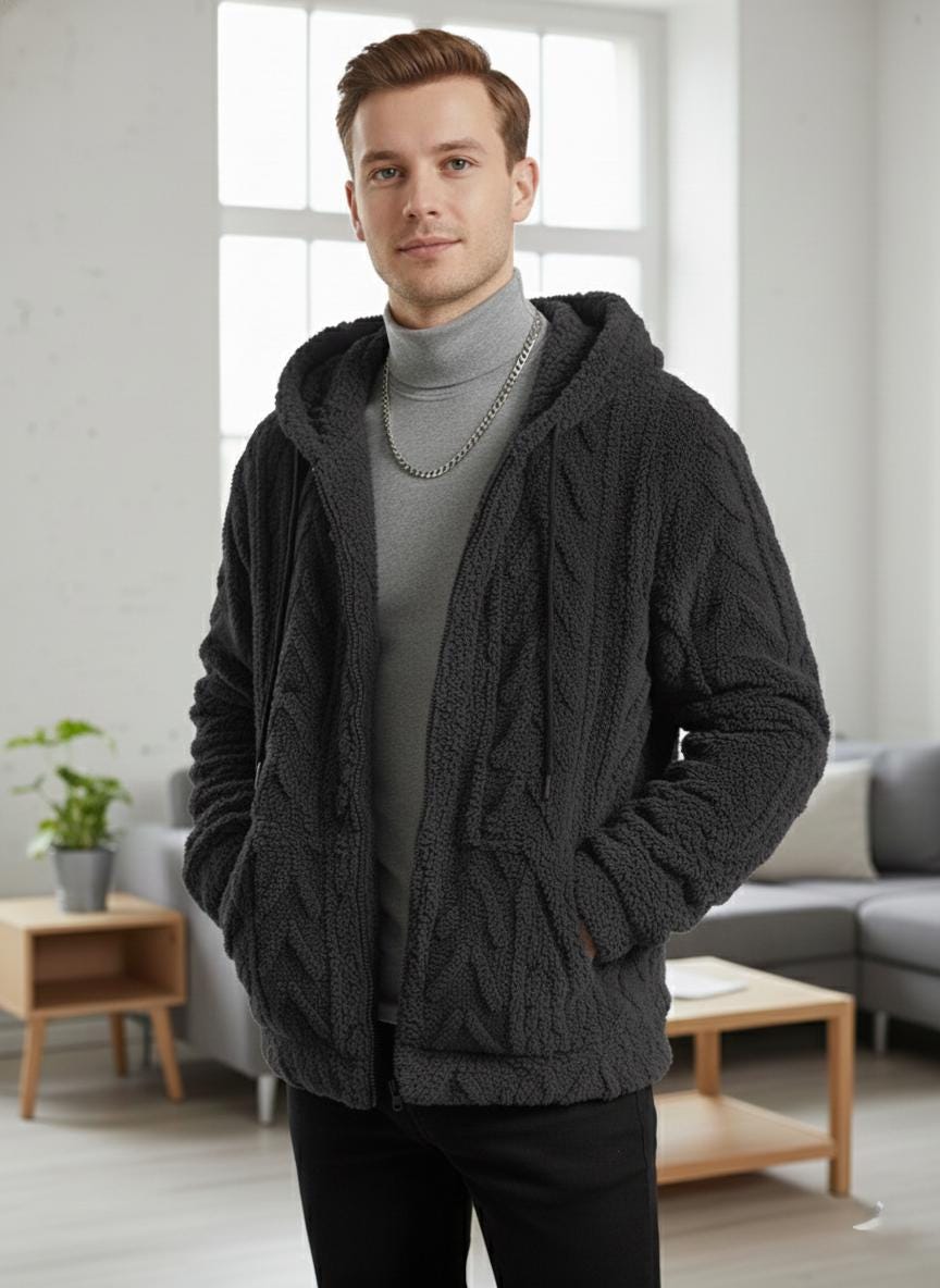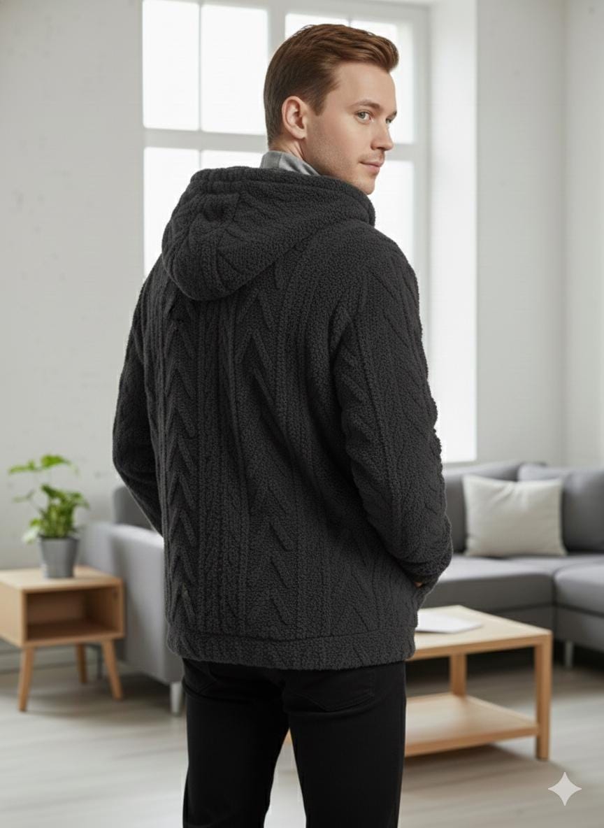 Stay warm and stylish with this Men’s Cozy Fleece Hoodie Jacket, crafted from ultra-soft 100% polyester for maximum comfort and durability. Designed with a plush sherpa texture and a chunky knit-inspired pattern, this zip-up hooded jacket blends modern style with everyday practicality.