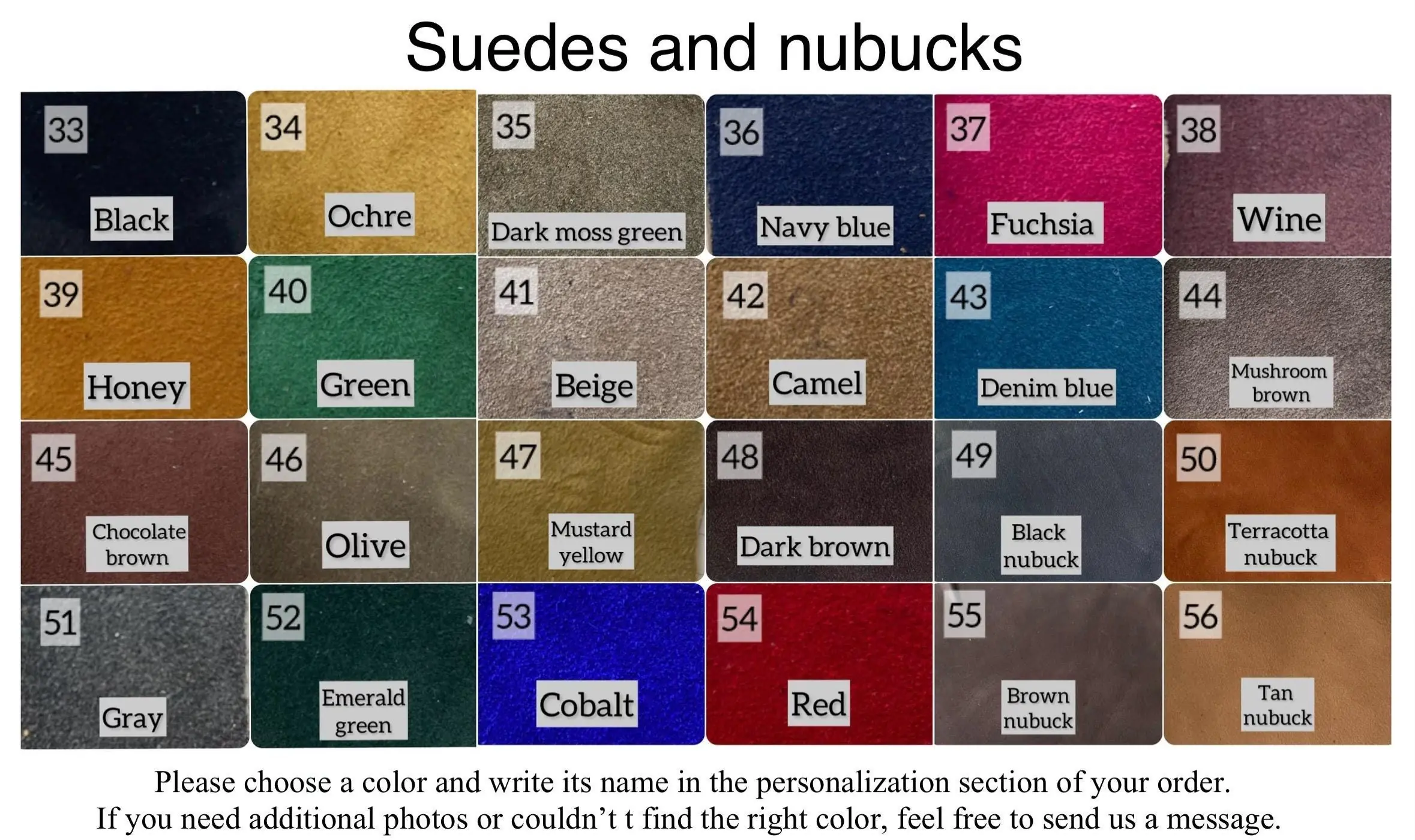 4. Fits true to size for the US. 5. You can order these shoes in other colors by filling out the “Personalization” field. See our Material Palletes on this page: 6. This sole is medium/regular width (B), but you can order shoes with slightly increased width by writing the phrase “large width” in the “Personalization” field. * PERSONALIZATION: If you have found a leather number you like in the material palette, place your order and write that number and all of your preferences in the Personalization tab. We will definitely contact you to clarify the details of the custom order. Personalization is FREE. In this item: