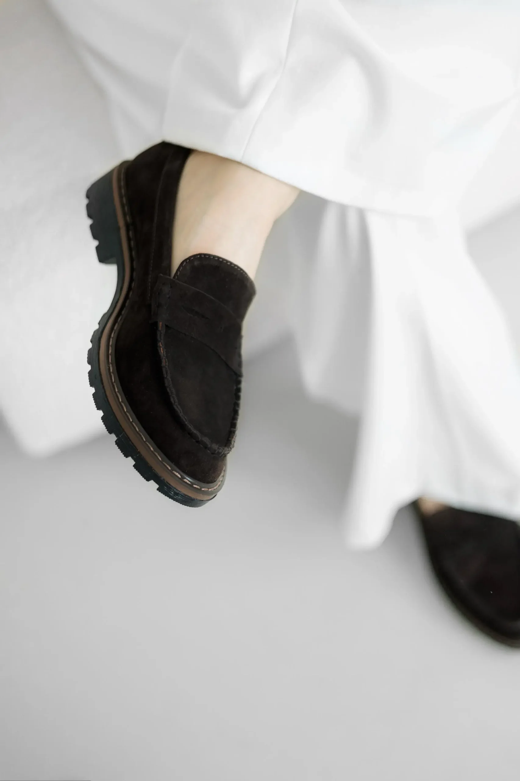 Discover timeless elegance and modern comfort with our Women’s Suede Penny Loafers in Dark Brown. Handcrafted from premium velour suede, these loafers feature a rich, deep brown color that pairs perfectly with any outfit — from casual denim to tailored trousers. The design is enhanced by a chunky, durable sole with a contrasting stitch detail, adding a contemporary edge to the classic penny loafer silhouette. The soft suede upper and comfortable insole ensure maximum comfort throughout the day, while the rugged sole provides excellent grip and stability. Key features: 1. Handcrafted in our workshop in Kyiv.